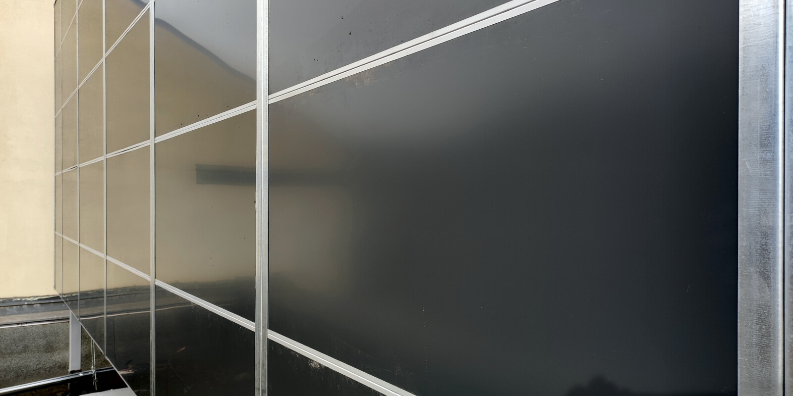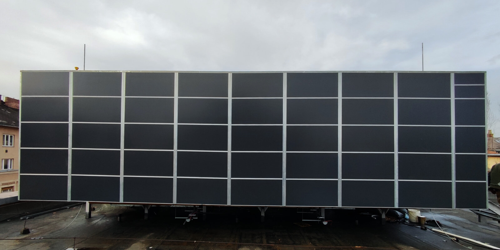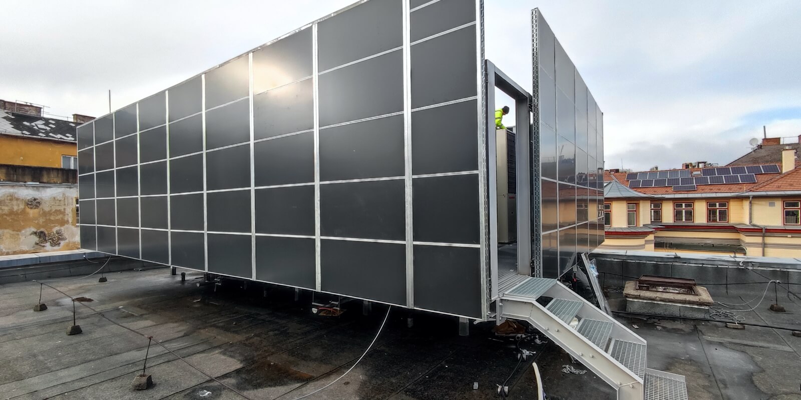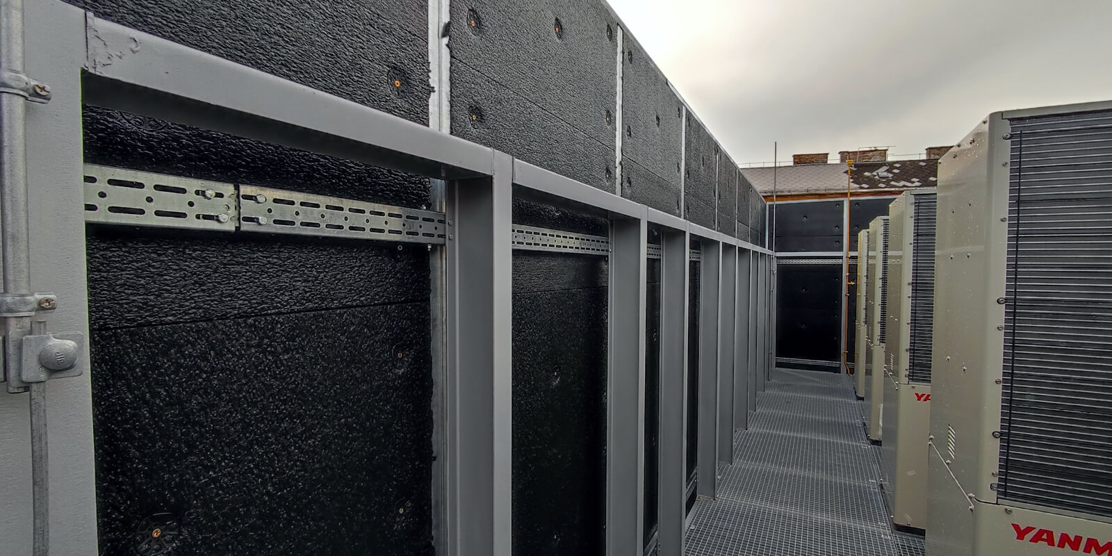 Egy lapostetőn emelvényre rögzített zajvédő fal. Az akusztikai tervezést követően, méretezett egyedi zajvédő fal építése, amely a berendezések üzemszerű működését nem befolyásolja.